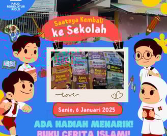 Pada hari pertama kembali ke sekolah, yaitu Senin, 6 Januari 2025, PAUD Roudlotur Ridlo memberikan kejutan menarik kepada para siswa. Setiap anak akan mendapatkan buku cerita islami sebagai hadiah. Buku-buku ini mengangkat kisah-kisah inspiratif dari tokoh-tokoh besar Islam seperti Muhammad Al-Fatih, Umar bin Khattab, Harun Ar-Rasyid, hingga Abu Bakar As-Shiddiq. Hadiah ini bertujuan tidak hanya untuk memberikan kesenangan kepada anak-anak, tetapi juga memperkenalkan mereka pada nilai-nilai islami yang penting sejak dini.